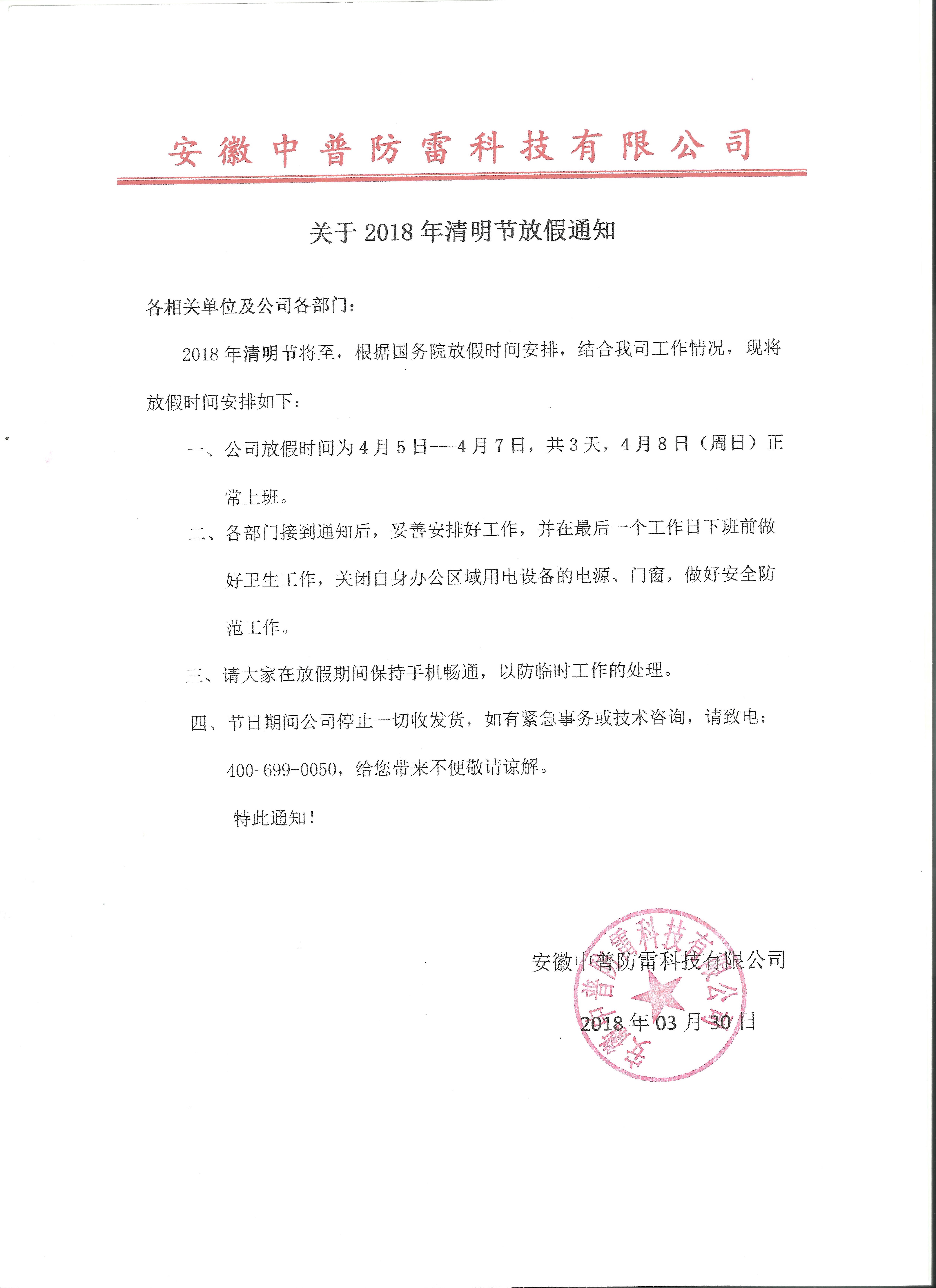 安徽中普防雷“關(guān)于2018年清明放假通知”