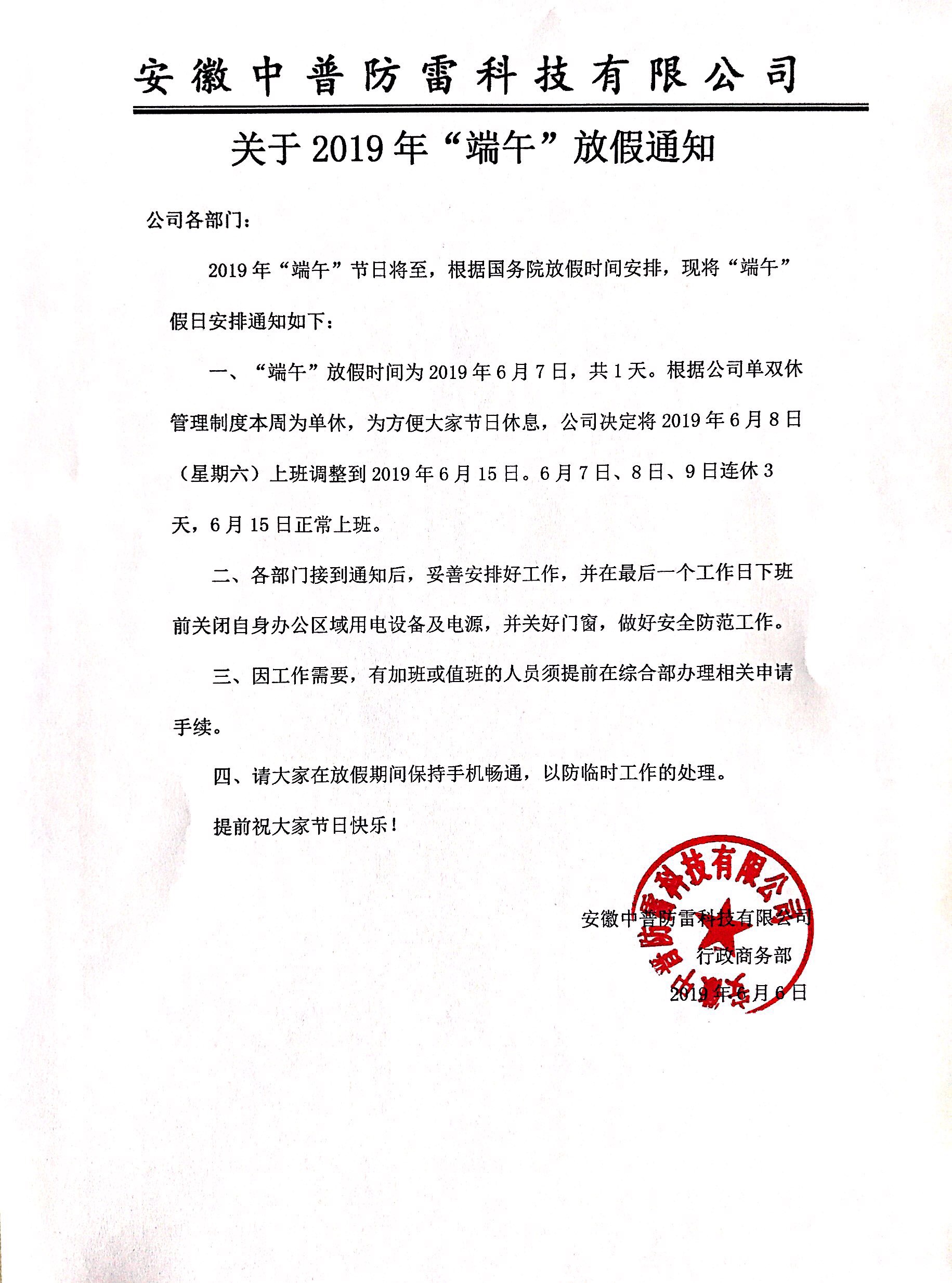 安徽中普防雷“關于2019年端午節(jié)放假通知”