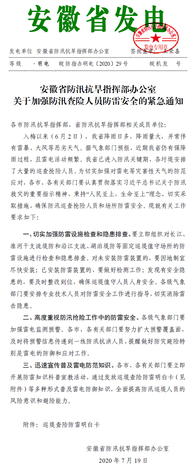 通知要求各市、各有關(guān)部門切實采取措施,確保防汛巡查搶險人員和場所防雷安全。