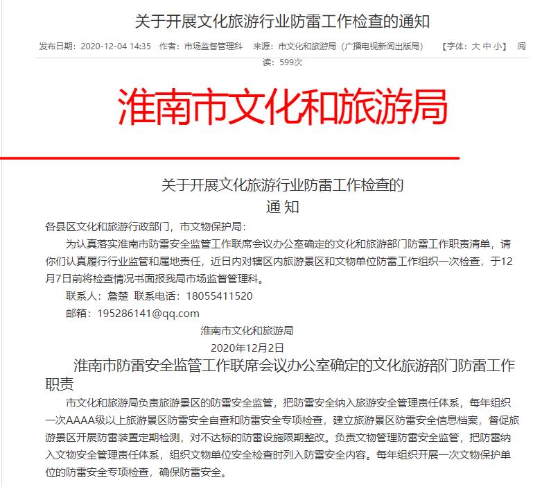 為認真落實淮南市防雷安全監(jiān)管工作聯(lián)席會議辦公室確定的文化和旅游部門防雷工作職責清單,請你們認真履行行業(yè)監(jiān)管和屬地責任,近日內(nèi)對轄區(qū)內(nèi)旅游景區(qū)和文物單位防雷工作組織一次檢查,于12月7日前將檢查情況書面報我局市場監(jiān)督管理科。